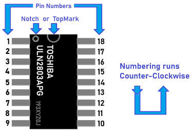 It is important to know where the top of the IC is to determine which pin is which. If the IC were inserted upside down for example, pin 1 would become pin 18, pin 2 would become pin 17, and so on. Sometimes the top mark is a cut-out or notch in the plastic, but it can just be a dot painted on.
